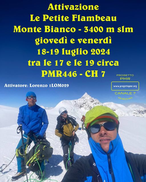 In attesa di tornare sul Monte Rosa, alla Capanna Regina Margherita, l’amico Lorenzo e i suoi amici, giovedì e venerdì saranno a Le Petit Flambeau, a circa 3400 m s.l.m.. Lorenzo ci dedicherà un’oretta in un orario compreso tra le 17 e le 19, entrambi i giorni, per fare qualche collegamento radio in PMR446, canale 7. Come sempre rimanete connessi sul gruppo Telegram di Piemonte, Liguria e VDA per aggiornamenti in tempo reale.