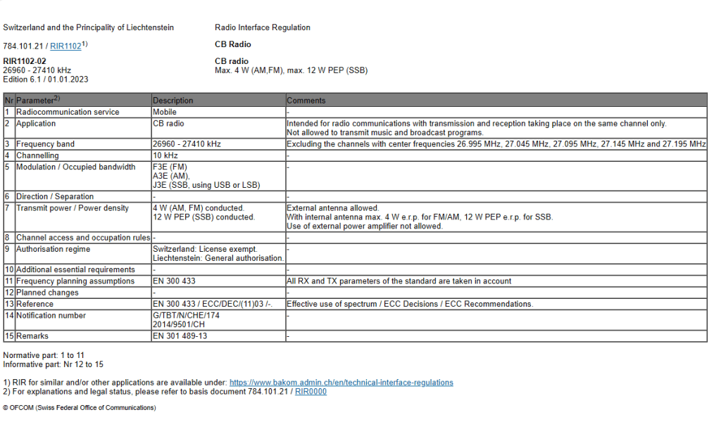 | RIR1102- 02 | CB radio | 26960 – 27410 kHz | Max. 4 W (AM,FM), max. 12 W PEP (SSB) | 6.1 | 01.01.2023 |