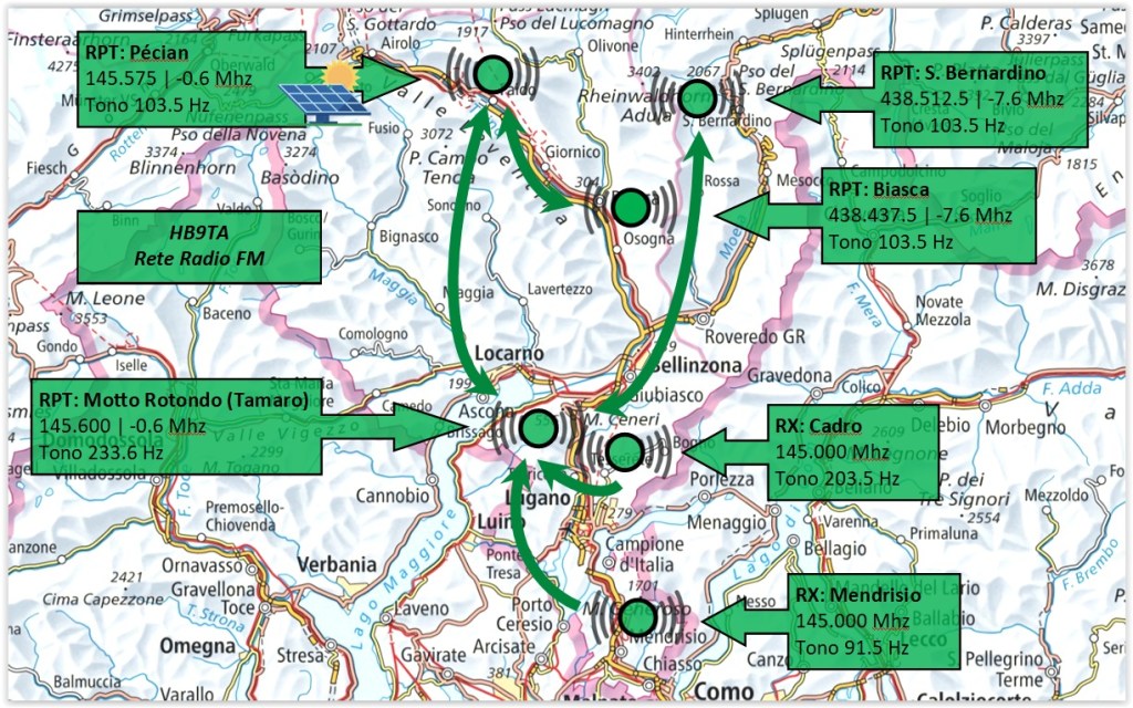 - il ripetitore collega da Bellinzona Nord e per tutta la Leventina, Valle Bedretto, San Gottardo. Il Ripetitore ha il link di collegamento su R0 Motto Rotondo IN e OUT .